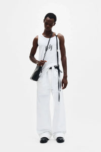 سروال مايكل 5 جيوب عالي الراحة - أبيض - فتحات حزام - شريط غروسغرين مميز قابل للإزالة - إغلاق بزر - 5 جيوب - حواف قابلة للطي - ساق واسعة - مقاس فضفاض - طول أرضي - 100% قطن - صنع في إيطاليا