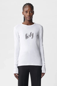 قميص فين بطبعة بأكمام طويلة - أبيض - ياقة دائرية - تطريز مقدس في الأمام - أكمام طويلة - 100% قطن - صنع في البرتغال