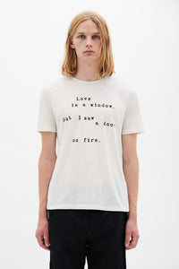 قميص ''الحب هو نافذة'' القياسي من بابتيست - طباشيري - رقبة مستديرة - طباعة أمامية ''الحب هو نافذة، لكنني رأيت بابًا مشتعلًا'' - 100% قطن - صنع في إيطاليا
