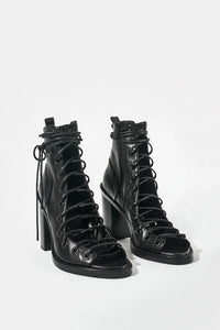 Damen schwarze Sandalen mit Schnürsenkeln- Schwarz- Schnürsenkel- Offene Spitze- Seitlicher Reißverschluss- Absatz: 10,5 cm- 100% Leder- Made in Italy