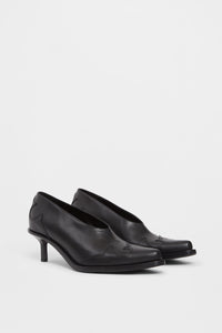 Janeka Western-Stitched Pumps - Black - Washed Grained Calfskin - Pointed Toe - Western-Inspired Stitching - Curved Vamp Line - Leather Covered Heel - Leather Sole - 100% Calf Leather - Made in Italy