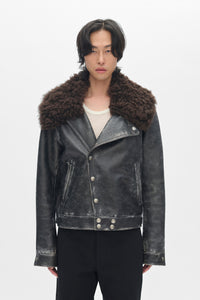 Binus Distressed Shearling Leather Jacket - Black - Distressed Calfskin - Removable Shearling Collar - Asymmetric Press Stud And Zip Closure -Side Zipped Pockets - Press Stud Cuffs - Back Western Shoulder Panel - Back Buckled Waist Straps - Boxy Fit - 100% Calf Leather - Made in Italy