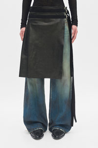 Mane Knee Lenght Kilt – Vintage Black – Apron Silhouette – Soft Lamb Leather with Hand-Finished Vintage Effect – Multi-Strap Belted Waist with Side Buckle Closure and Long Ties – Asymmetric Wrap Construction – Back Flap Pocket Detail – Raw-Edge Hem for a Deconstructed Look – Unlined – 100% Lamb Leather – Made in Italy
