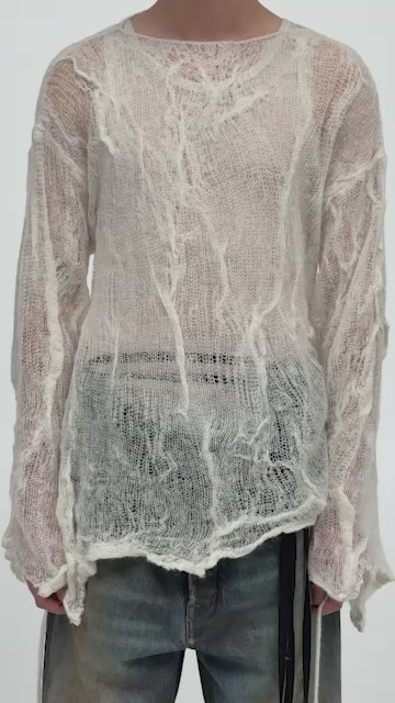 Jochen High Comfort Asymmetric Sweater – Natural White - Deconstructed Felted Wool Mesh Knit – 45% Alpaca, 35% Polyamide, 20% Wool – Made in Italy