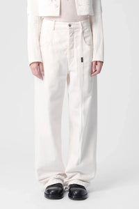 Women's Claire 5 Pocket Comfort Trousers - Chalk White - Faded Denim - Belt Holes - Removable Signature Grosgrain Ribbon - Button Closure - 5 Pockets - Comfort Fit - 100% Cotton - Made In Italy.