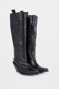 Lidar Western Boots - Black - Washed Grained Calfskin - Western Stitching Details - Pointed Toe - Back Signature Rivet - Side Pull Tabs - Leather Sole - Wedge heel - 100% Calf Leather - Made in Italy