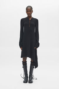 Cordule Lace-Up Serafino Dress - Black - Crewneck - Quarter Lace-Up Closure - Trumpet Cuffs - Side Draped Panel - Asymmetric Hem - 100% Wool - Made in Italy