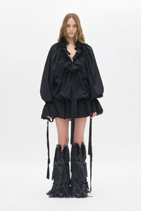 Bregje Ruffled Mini Dress with Drawstrings – Black - Mini silhouette with voluminous ruffled hem - Balloon sleeves with gathered cuffs – 100% Cotton – Made in Italy