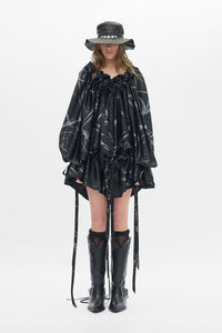 Bregje Ruffled Dress With Drawsting Dreamcatcher Print - Black, Grey - Satin-Effect Fabric – Deep V-Neckline with Cascading Ruffle Trim – Long Voluminous Sleeves with Ruffled Cuffs and Ties – Relaxed Oversized Silhouette – Adjustable Drawstring Waist – Short Hem with Ruffle Finish - 100% Silk - Made in Italy