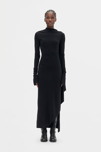 Vabu Long Dress - Black - Felted Wool Knit - Cowl Neck with Scarf Panel - Long Sleeves - Flared Cuffs - Side Split - Asymmetric Hem - Draped - Slim fit - 100% Wool - Made in Italy