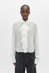 Nare Slim Fit Ruffle Shirt - Naural White- Georgette Vap - Classic Collar - Button closure With ruffled trim - Elongated long sleeves - Buttoned cuffs - Darted back - 100% Silk - Made in Italy