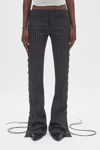 Kel Slim Fit Bootcut Trousers – Black,White, Cherry – Mid-Rise Waist with Belt Loops – Slim Fit Through the Thigh – Flared Leg Opening – Lace-Up Detailing with Eyelets Along the Side Seams – Elongated Drawstrings Creating Flowing Accents – Back Flap and Welt Pockets with Button Closure – Floor-Length Hem – 68% Viscose, 31% Virgin Wool, 1% Polyester – Made in Italy