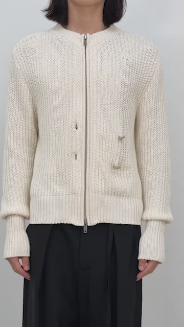 Ismael Zipped Knit Bomber - Natural White - Soft Cotton-Wool Blend - Double Closure with Zipper and Buttons - Ribbed Texture - Elegant Collarless Design - Unlined - 85% Cotton 15% Wool - Made in Italy
