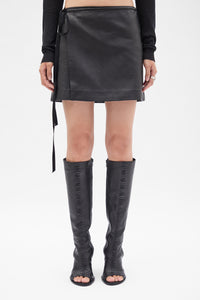 Jolien Mini Skirt - Black - Satin Structured Leather - Front self-tie wrap - Straight Cut - 100% Lambskikn - Made in Italy