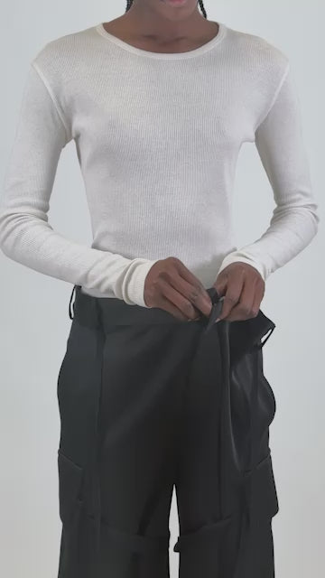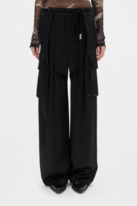 Fressa Cargo Pants in Fluid Cady Satin - Black - Fluid Cady Satin - Belt Holes - Hook and Zip Closure - Adjustable and Removable Self-Tie Ribbon - Side Pockets - Cargo Pockets with Signature Buckled Grosgrain Straps - Drawstring Hems - Relaxed Fit - 73% Acrylic, 27% Viscose - Made in Italy