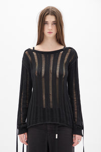 Pull court en maille échelle Gala avec lacets - Noir - Tricot transparent - Détails en ruban - Col bateau - Manches longues - Coupe décontractée - 100% coton - Fabriqué au Portugal