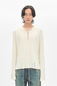 Deder Pull Serafino à Lacets - Blanc - Encolure en V à lacets avec cordon ton sur ton - Ourlet droit avec légère usure - 70% Laine, 30% Cachemire - Made in Italy
