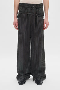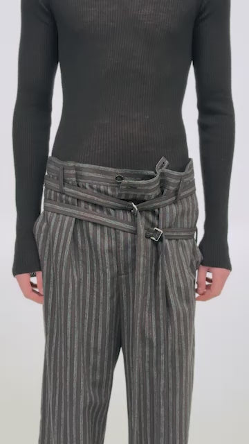 Woubrecht High Comfort Double Belted Trousers - Pinstripe - High Waist - Double Waistband with Buckle Details - Zip Fly with Button Closure - Side Seam Pockets - Back Welt Pockets with Button - Extra Long Hem - Wide Fit - 68% Viscose,31% Virgin Wool, 1% Polyurethane - Made in Italy
