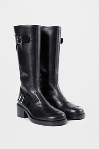 Balo High Biker Boots - Black - Knee-high Silhouette- Smooth Calf Leather Construction - Rear Full-Length - Silver Zipper Closure - Adjustable Buckle Straps At Ankle And Upper Shaft Paneled Design With Tonal Stitching - Round toe - 100% Calf Leather - Made in Italy