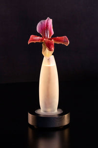 With the streamlined, slender Lys, Ann Demeulemeester literally puts the flowers in thespotlight. The vase contains a rechargeable light source in its wooden base, illuminating the flowers from the inside. The light not only passes through the glass and the water but also through the flower itself. The Lys vases are breathtaking even with a single well chosen flower.source.