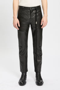 Govaart Pantaloni Slim Fit a 5 Tasche - Nero - Pelle Strutturata Satinata - Fori per Cintura - Cinturino Grosgrain Rimovibile con Firma - Chiusura a Bottone e Zip - 100% Pelle di Agnello - Made in Italy