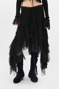 Gonna Midi Bete con Volant in Creponne di Seta - Nero - Cotone e Creponne di Seta - Fascia Elastica in Vita - Design a Balze Stratificate - Orlo Asimmetrico Fluente - Base 100% Cotone - Made in Italy