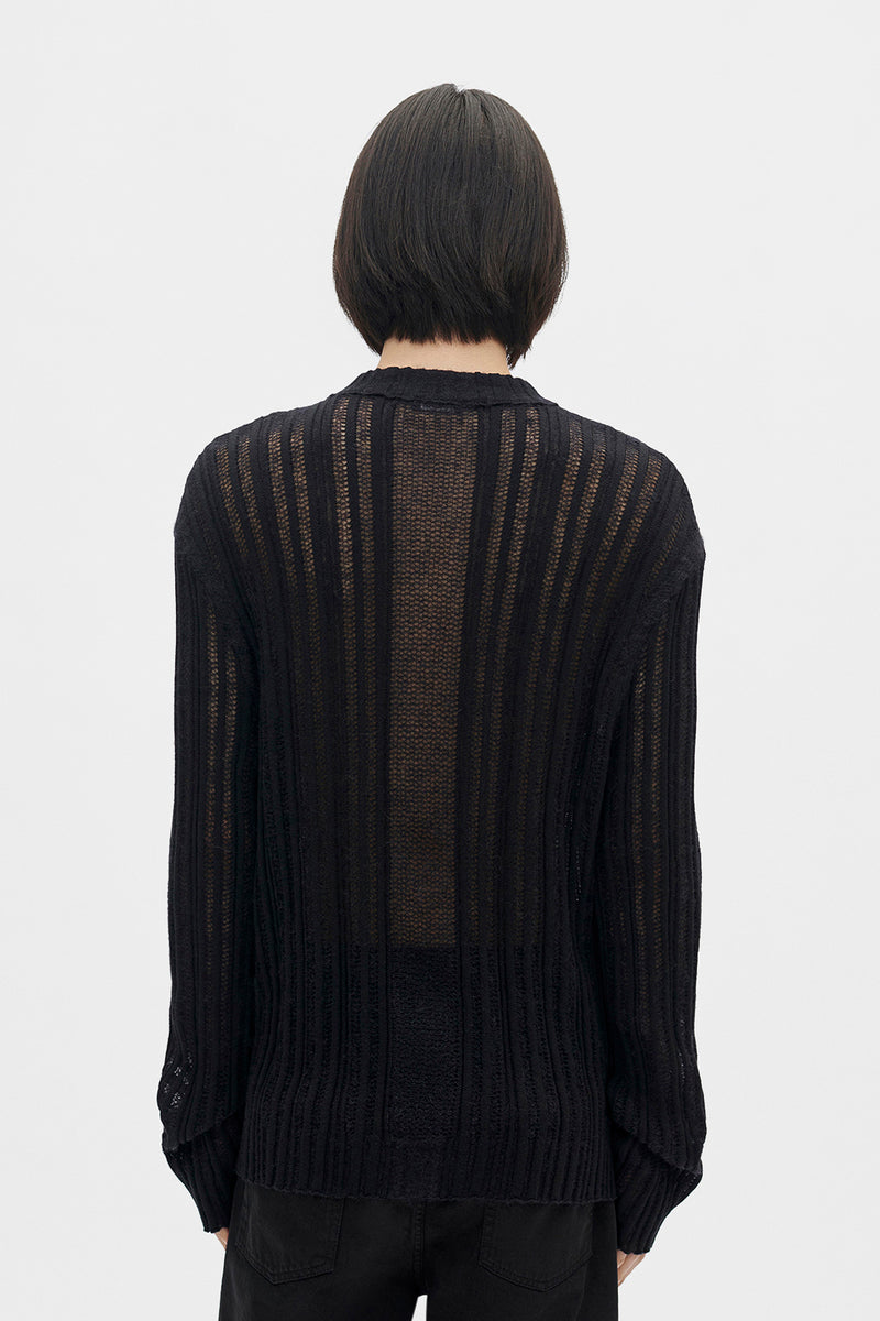 Maglione Halvar - Nero - Cotone Spazzolato Irregolare a Coste - Girocollo - Spalle Cadenti - Orlo e Polsini a Bordi Grezzi - Vestibilità Slim - 50% Cotone, 30% Cashmere, 20% Seta - Made in Italy