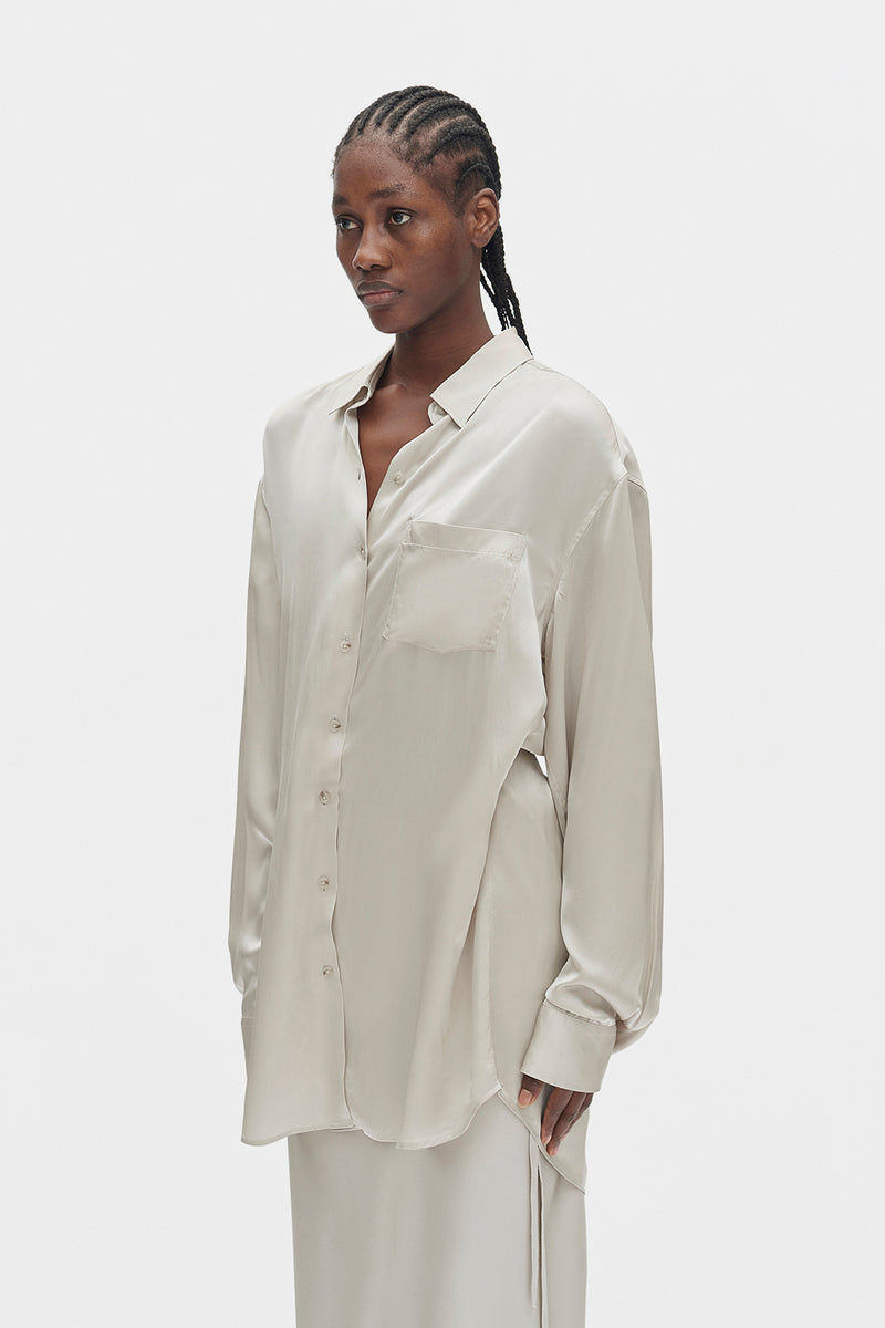 Camicia ad alto comfort Elisabeth Long - Perla - Seta lavata satinata - Classico Colletti - Chiusura con bottoni - Spalle scese - Maniche lunghe - Polsini con bottoni - Orlo allungato - Vestibilità oversize ritorta - 100% Seta - Made in Italy