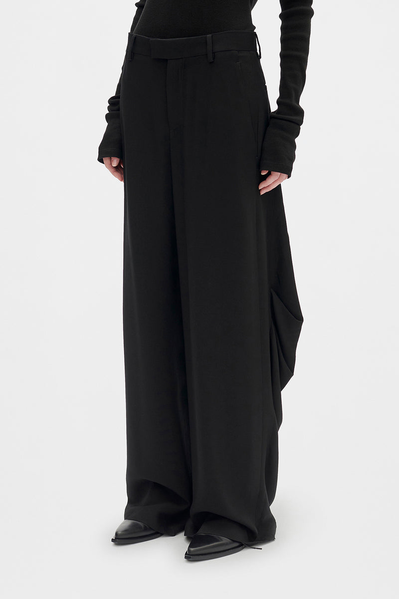 Odeta Draped Comfort Trousers - Black - Viscose Calico - Belt Holes - Hook and Zip Closure - Side Pockets - Back Pockets - Slouched Wide Leg - Floor Length - loose Fit - 100% Viscose - Made in Italy