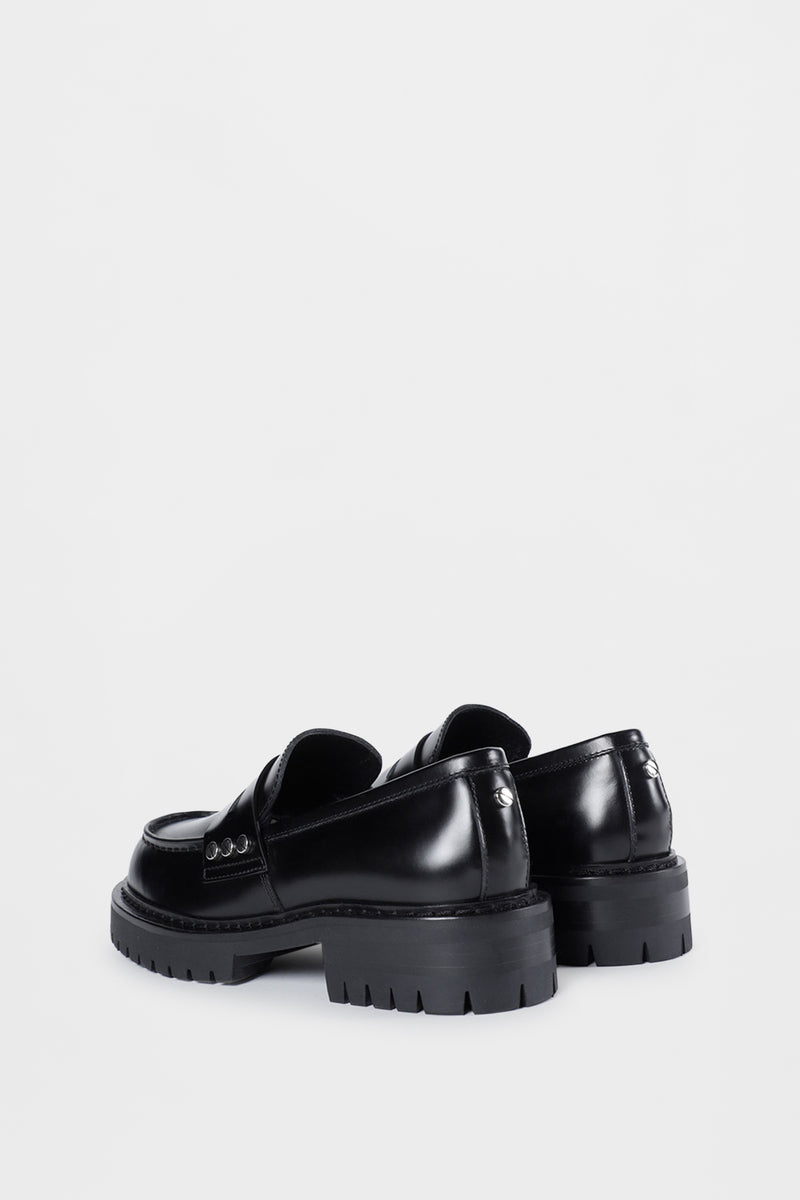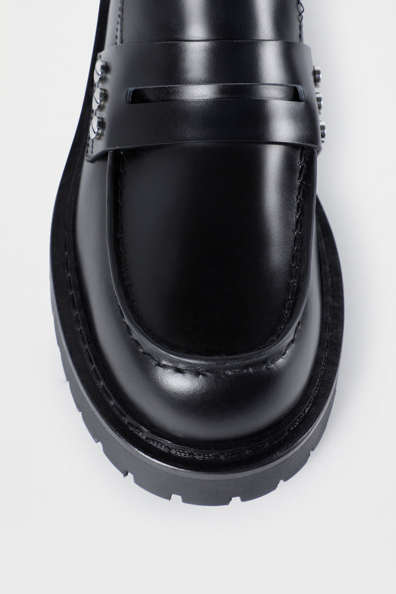 Baldur Penny Loafers - Black - Semi-Gloss Leather - Front and Back Signature Rivets - Front Apron - Cleated Rubber Sole - 100% Calf Leather - Made in Italy